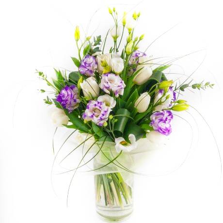 Весенний букет из тюльпанов и лизиантусов лучше всего сможет рассказать о ваших чувствах, а также подарить любимому и дорогому человеку море радостных эмоций.